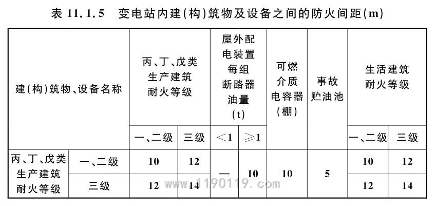 根据火力发电厂与变电站设计规范,储存含油设备的仓库(火灾危险性为丁级),防火距离 是根据屋外配电装置含油量控制(小于1t无间距要求,大于1t防火间距大于10米)。