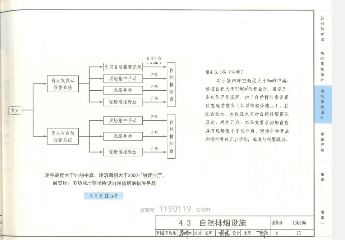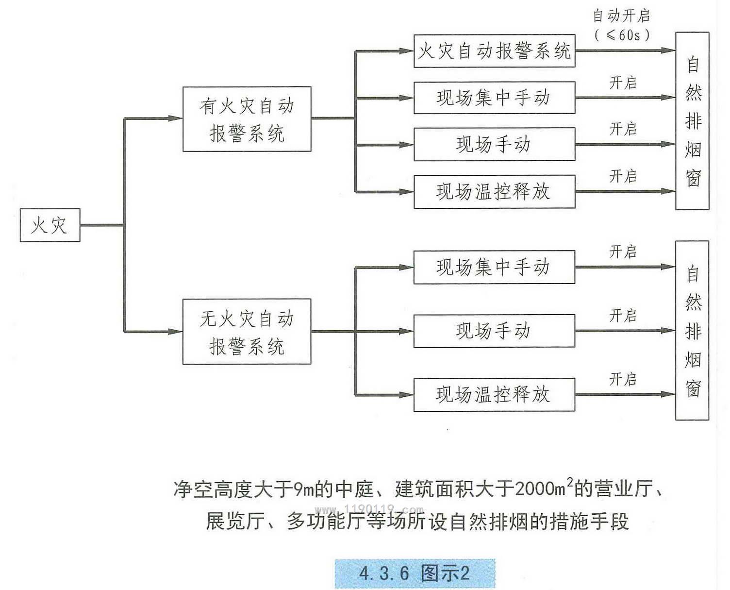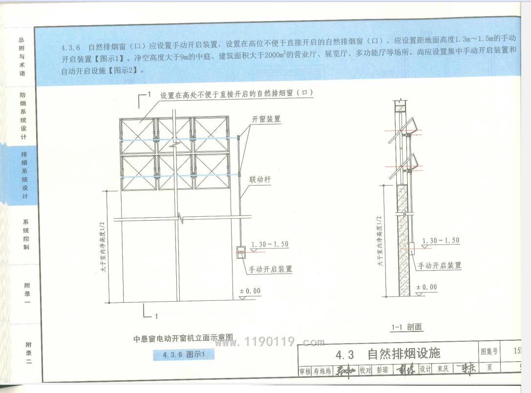 4.3.6 自然排烟窗(口)应设置手动开启装置,设置在高位不便于直接开启的自然排烟窗(口),应设置距地面高度1.3m〜1.5 m的手动开启装置。净空高度大于9m的中庭、建筑面积大于2000㎡的营业厅、展览厅、多功能厅等场所,尚应设置集中手动开启装置和自动开启设施。