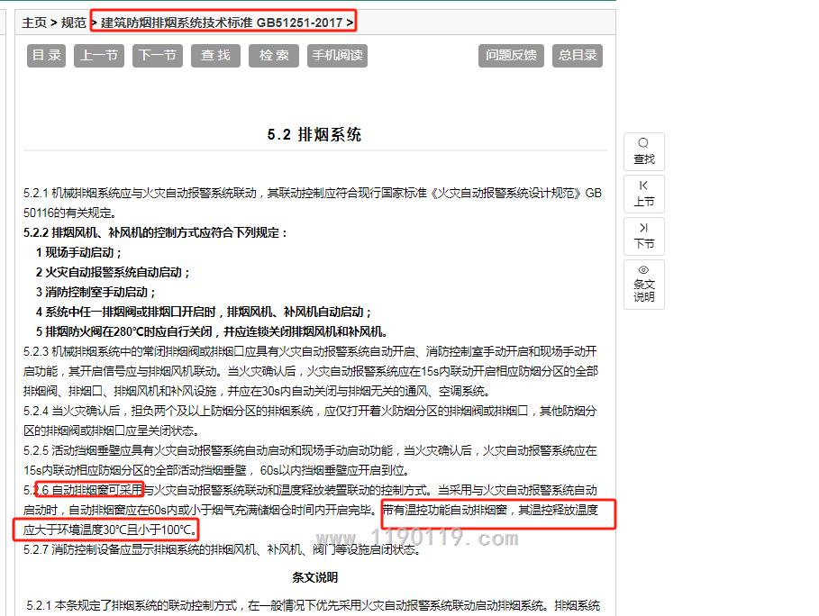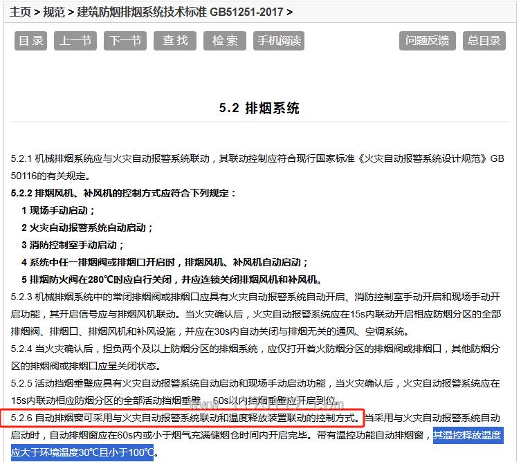5.2.6 自动排烟窗可采用与火灾自动报警系统联动和温度释放装置联动的控制方式。当采用与火灾自动报警系统自动启动时,自动排烟窗应在60s内或小于烟气充满储烟仓时间内开启完毕。带有温控功能自动排烟窗,其温控释放温度应大于环境温度30℃且小于100℃。