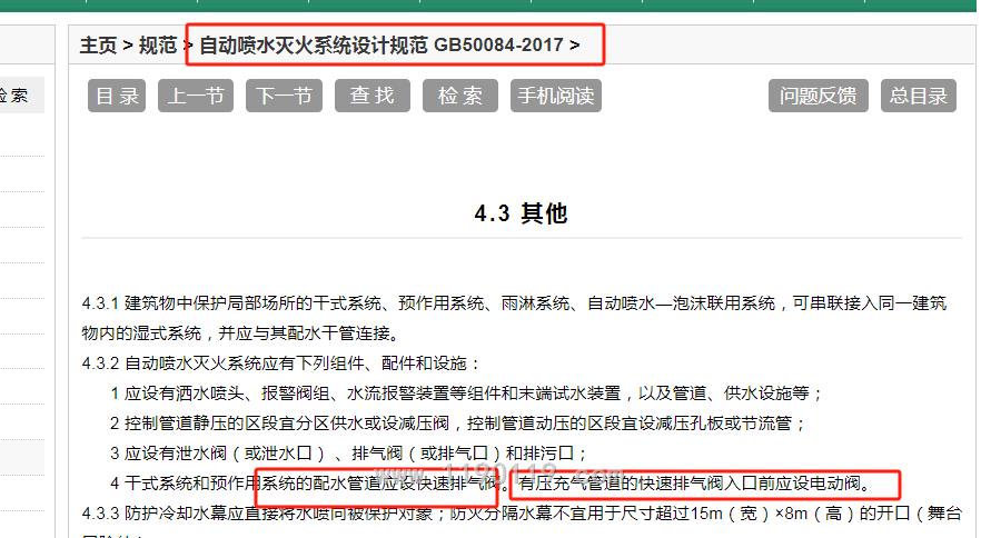 首先干式或者预作用系统都需要设置快速排气阀。没有设置气泵的预作用系统不需要在快速排气阀前设置电动阀或者电磁阀。