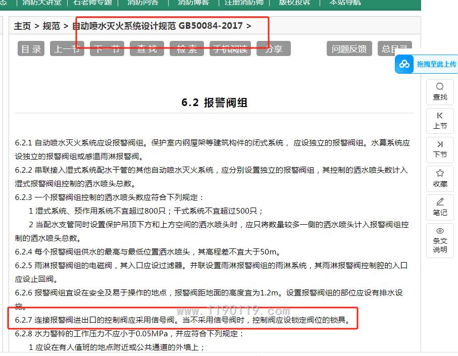 连接报警阀进出口的控制阀应采用信号阀。当不采用信号阀时,控制阀应设锁定阀位的锁具。水流指示器前应设置信号阀。