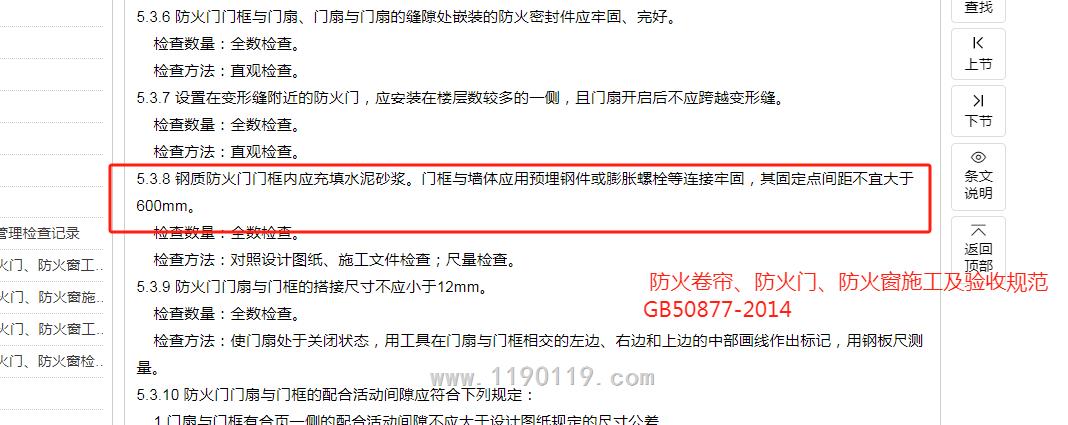 5.3.8 钢质防火门门框内应充填水泥砂浆。门框与墙体应用预埋钢件或膨胀螺栓等连接牢固,其固定点间距不宜大于600mm。