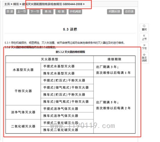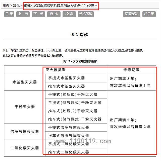 手提式及推车式灭火器的维修期限可以按建筑灭火器配置验收及检查规范 GB50444-2008 的要求(作为推荐性条文执行):干粉灭火器、洁净灭火器、二氧化碳灭火器,出厂满5年及首次维修后每满2年(水基型灭火器出厂满3年及首次维修后每满1年)
