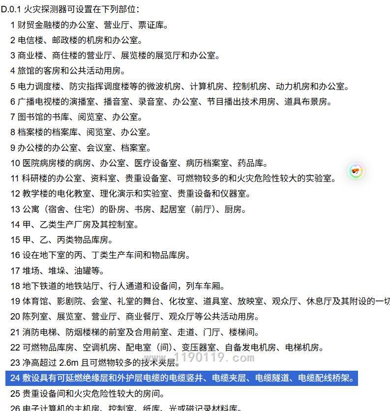 《火灾自动报警系统设计规范 GB50116-2013》附录D 火灾探测器的具体设置部位24 敷设具有可延燃绝缘层和外护层电缆的电缆竖井、电缆夹层、电缆隧道、电缆配线桥架。