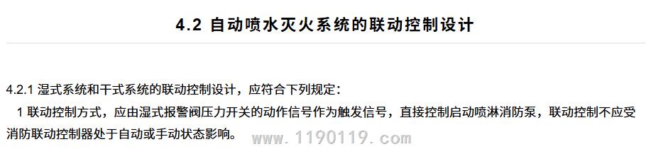1 联动控制方式,应由湿式报警阀压力开关的动作信号作为触发信号,直接控制启动喷淋消防泵,联动控制不应受消防联动控制器处于自动或手动状态影响。