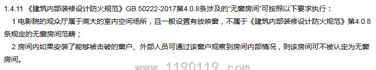 这封建科院的回函大有值得商榷之处,电影院观众厅恰恰正好符合:火灾初起阶段不易被发觉,发现起火时,火势往往已经较大;消防人员进行火情侦察和施救比较困难等因素,放映室内本身也有可燃物,谁也不能保证火灾不会蔓延到放映室甚至有可能放映室着火蔓延至观众厅,其观察窗相比房间与无可燃物的走道之间的观察窗性质完全不同,观众厅虽然一般都会有排烟系统,但排烟从来不作为室内装修材料燃烧性能的考虑要素,唯一的理由是观众厅空间较高,感觉有点无法自洽啊,真不知哪些专家给出的这种意见?另外无窗房间室内采用B1级装修材料而不对其烟毒性加以限制,对人员疏散极为不利,等到消防人员来到观察窗前,可能黄花菜早都凉了。