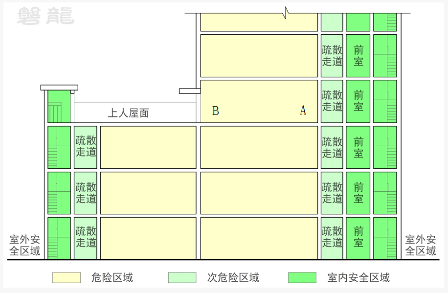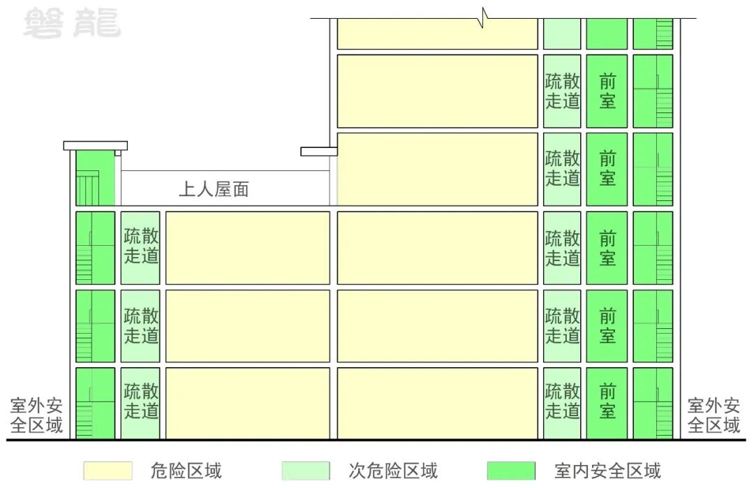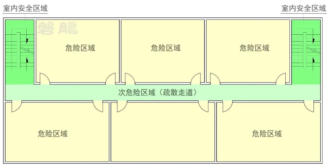 疏散走道是疏散通道的一部分,通常指从房间疏散门至安全出口之间的路径。疏散走道属于次危险区域【图示3】,其基本要求如下: