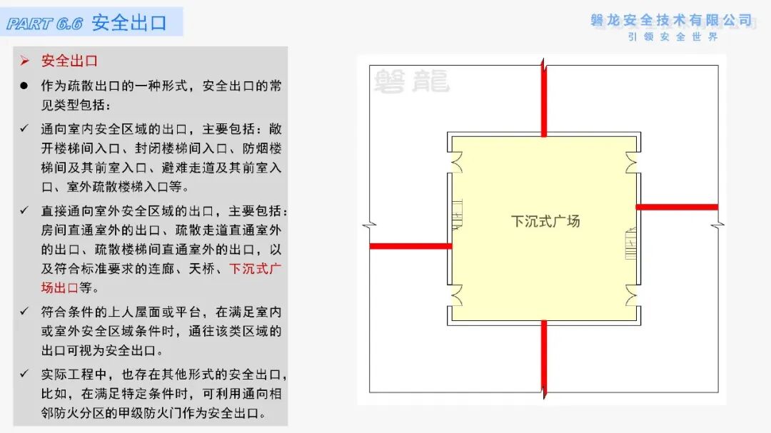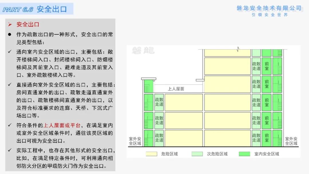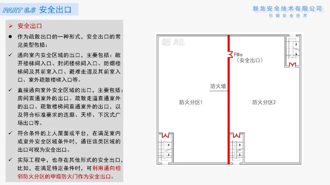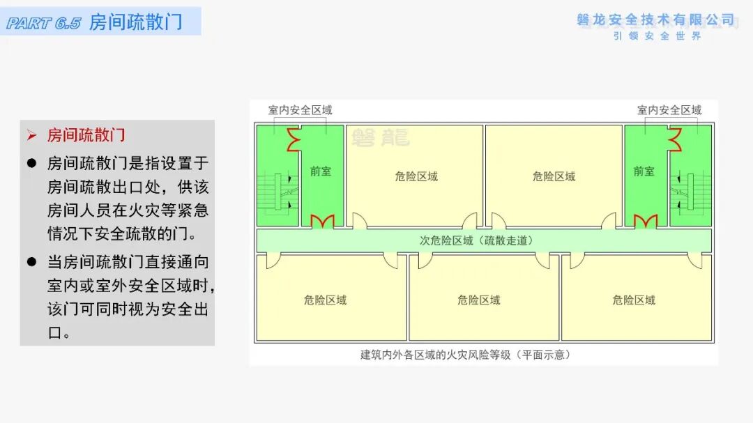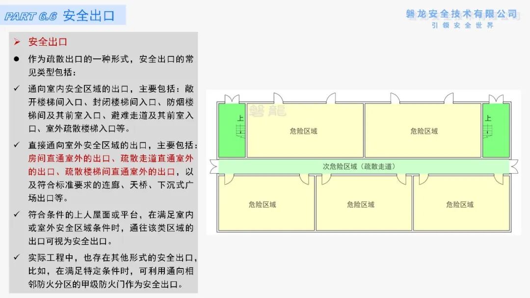 疏散出口主要包括房间疏散门和安全出口。当房间疏散门直接通向室内或室外安全区域时,该门可同时视为安全出口。