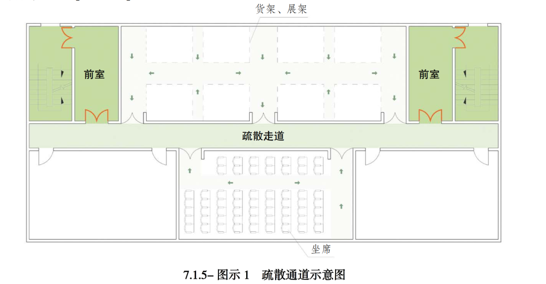 (2)疏散走道:是疏散通道的一部分,通常指从房间疏散门至安全出口之间的路径。