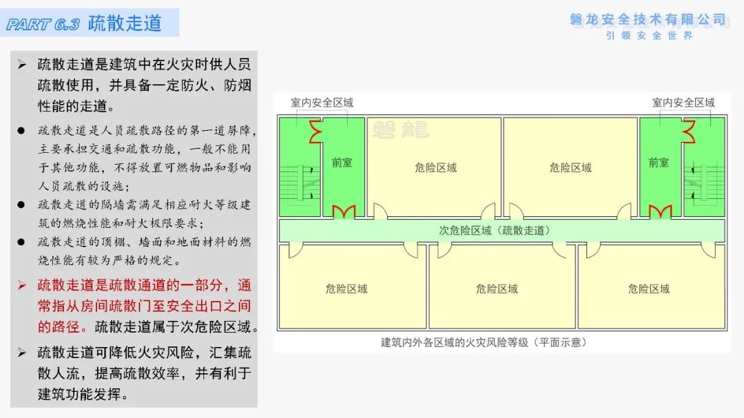 疏散走道是疏散通道的一部分,位于房间疏散门至安全出口间,具备一定的防火防烟性能,承担人流汇集与疏散功能。