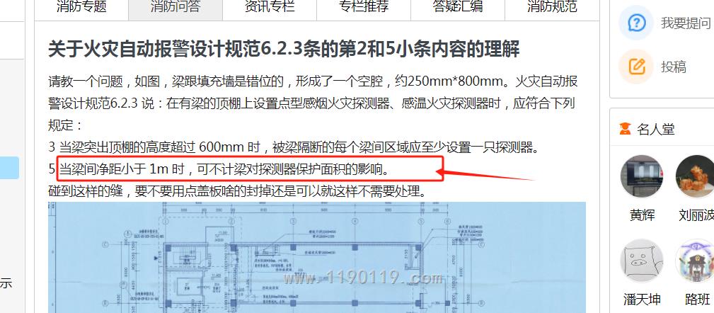 请教一个问题,如图,梁跟填充墙是错位的,形成了一个空腔,约250mm*800mm。火灾自动报警设计规范6.2.3 说:在有梁的顶棚上设置点型感烟火灾探测器、感温火灾探测器时,应符合下列规定: