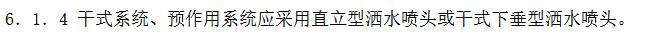 自动喷水灭火系统设计规范 GB50084-2017 6.1.4 干式系统、预作用系统应采用直立型洒水喷头或干式下垂型洒水喷头。条文解释:6.1.4 为便于系统在灭火或维修后恢复准工作状态之前排尽管道中的积水,同时有利于在系统启动时排气,要求干式、预作用系统的喷头采用直立型喷头或干式下垂型喷头。