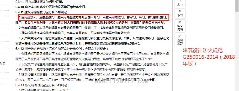 这里是强条:6.4.11 建筑内的疏散门应符合下列规定: 1 民用建筑和厂房的疏散门,应采用向疏散方向开启的平开门,不应采用推拉门、卷帘门、吊门、转门和折叠门。除甲、乙类生产车间外,人数不超过60人且每樘门的平均疏散人数不超过30人的房间,其疏散门的开启方向不限。