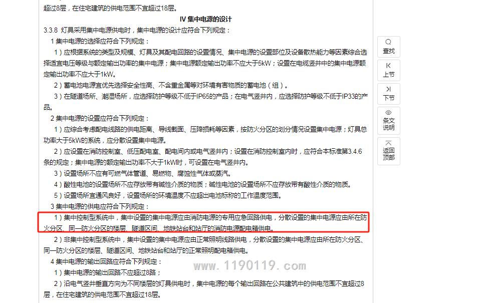 1)应综合考虑配电线路的供电距离、导线截面、压降损耗等因素,按防火分区的划分情况设置集中电源;灯具总功率大于5kW的系统,应分散设置集中电源。