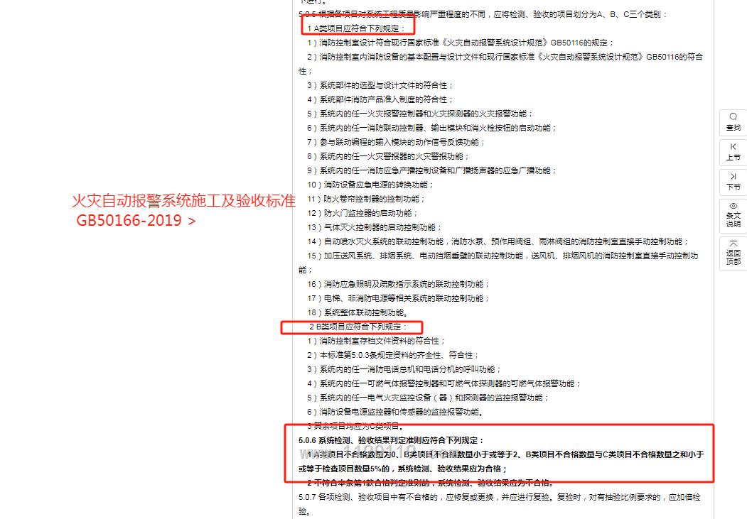 5.0.5 根据各项目对系统工程质量影响严重程度的不同,应将检测、验收的项目划分为A、B、C三个类别: 1 A类项目应符合下列规定: 1)消防控制室设计符合现行国家标准《火灾自动报警系统设计规范》GB50116的规定; 2)消防控制室内消防设备的基本配置与设计文件和现行国家标准《火灾自动报警系统设计规范》GB50116的符合性; 3)系统部件的选型与设计文件的符合性; 4)系统部件消防产品准入制度的符合性; 5)系统内的任一火灾报警控制器和火灾探测器的火灾报警功能; 6)系统内的任一消防联动控制器、输出模块和消火栓按钮的启动功能; 7)参与联动编程的输入模块的动作信号反馈功能; 8)系统内的任一火灾警报器的火灾警报功能; 9)系统内的任一消防应急产播控制设备和广播扬声器的应急广播功能; 10)消防设备应急电源的转换功能; 11)防火卷帘控制器的控制功能; 12)防火门监控器的启动功能; 13)气体灭火控制器的启动控制功能; 14)自动喷水灭火系统的联动控制功能,消防水泵、预作用阀组、雨淋阀组的消防控制室直接手动控制功能; 15)加压送风系统、排烟系统、电动挡烟垂壁的联动控制功能,送风机、排烟风机的消防控制室直接手动控制功能; 16)消防应急照明及疏散指示系统的联动控制功能; 17)电梯、非消防电源等相关系统的联动控制功能; 18)系统整体联动控制功能。 2 B类项目应符合下列规定: 1)消防控制室存档文件资料的符合性; 2)本标准第5.0.3条规定资料的齐全性、符合性; 3)系统内的任一消防电话总机和电话分机的呼叫功能; 4)系统内的任一可燃气体报警控制器和可燃气体探测器的可燃气体报警功能; 5)系统内的任一电气火灾监控设备(器)和探测器的监控报警功能; 6)消防设备电源监控器和传感器的监控报警功能。 3 其余项目均应为C类项目。 5.0.6 系统检测、验收结果判定准则应符合下列规定: 1 A类项目不合格数量为0、B类项目不合格数量小于或等于2、B类项目不合格数量与C类项目不合格数量之和小于或等于检查项目数量5%的,系统检测、验收结果应为合格; 2 不符合本条第1款合格判定准则的,系统检测、验收结果应为不合格。