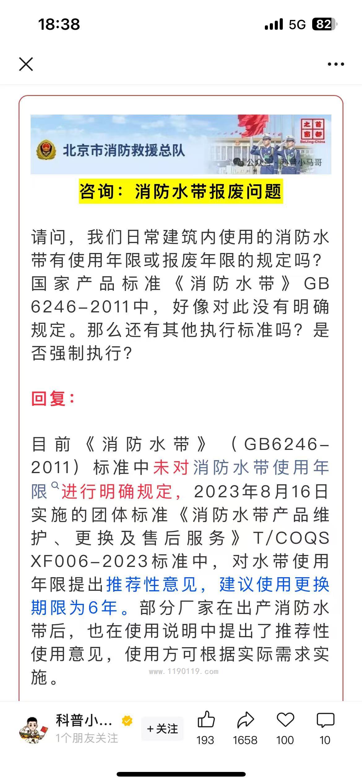 按照厂家标明的消防水带使用期限来,另外就是根据使用场所状况来评估,比厂家所规定的使用期限提前报废也可能。