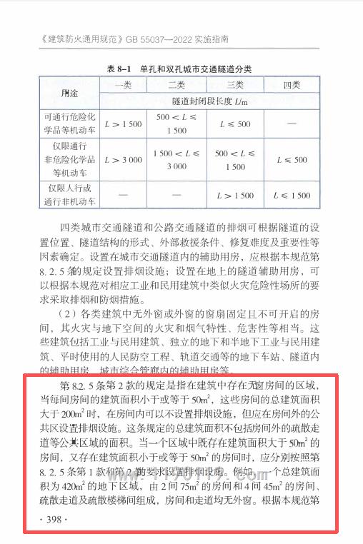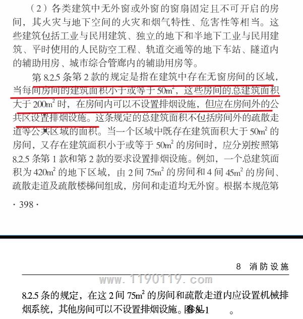 8.5.4 地下或半地下建筑(室)、地上建筑内的无窗房间,当总建筑面积大于200m²或一个房间建筑面积大于50m²,且经常有人停留或可燃物较多时,应设置排烟设施。(强条)