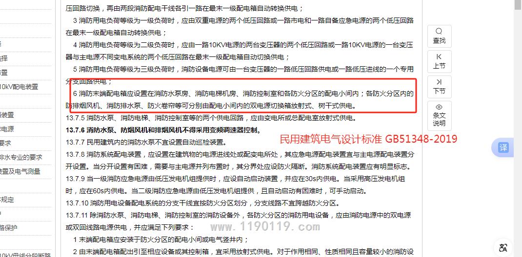 6 消防末端配电箱应设置在消防水泵房、消防电梯机房、消防控制室和各防火分区的配电小间内;各防火分区内的防排烟风机、消防排水泵、防火卷帘等可分别由配电小间内的双电源切换箱放射式、树干式供电。