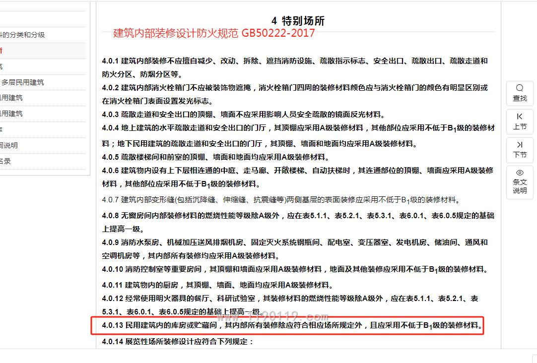 4.0.13 民用建筑内的库房或贮藏间,其内部所有装修除应符合相应场所规定外,且应采用不低于B1级的装修材料。