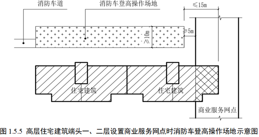 答:高层住宅建筑端头一、二层设置商业服务网点等住宅附建公共用房时,当其与住宅的交接部位长度不大于10m且消防车登高扑救可到达该单元的楼梯间或每户住宅时,该高层住宅可视作满足消防车登高操作场地要求(图1.5.5)。满足尽头式消防车道要求时,可不设置穿过建筑物的消防车道;
