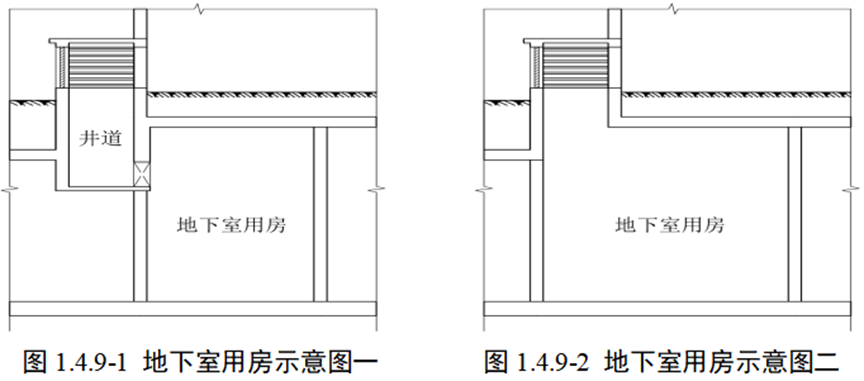 答:应符合不同防火分区之间的外墙上门、窗、洞口之间最近边缘的水平距离和不同楼层上、下层开口之间实体窗槛墙高度要求。当地下室用房或设备管道,通过通风井道连接其地面通风洞口时(地下室排烟井道除外,图1.4.9-1),可将分隔地下室用房与通风井道之间的墙体做为地下室外墙,相应间距可计算至上述地下室外墙上的洞口;当地下室用房或设备管道直接与地下室出地面通风洞口相连通时(图1.4.9-2),则应将该地面通风洞口所处墙体作为地下室外墙;