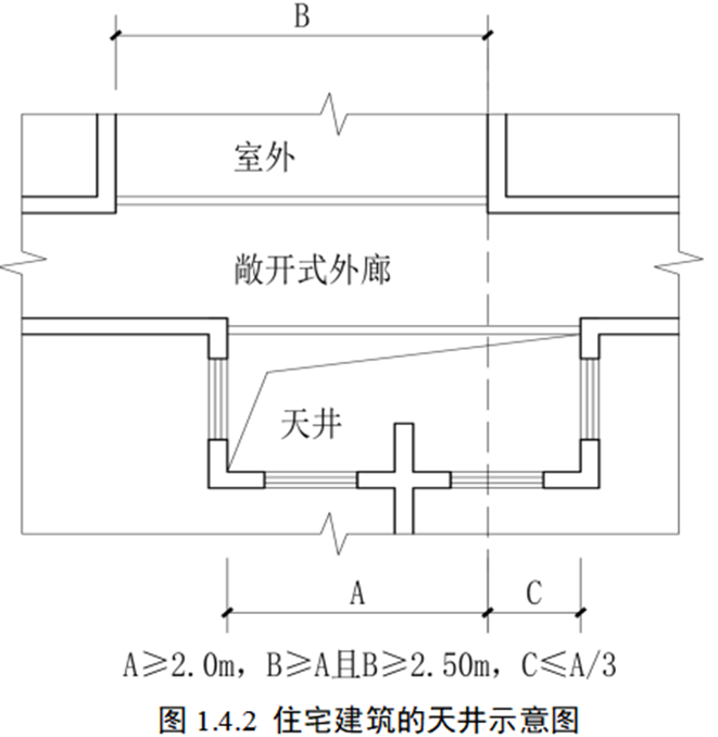 住宅建筑的各层天井(含底部)均应设置成U型,应按附图3.5.3-1设置,内天井宽度A和开口宽度B宜对应设置,当B>6m时B可取6m;与疏散无关的门、窗不得直接开向敞廊,开向天井的门窗洞口距离敞廊不得小于1.0m(附图3.5.3-2);