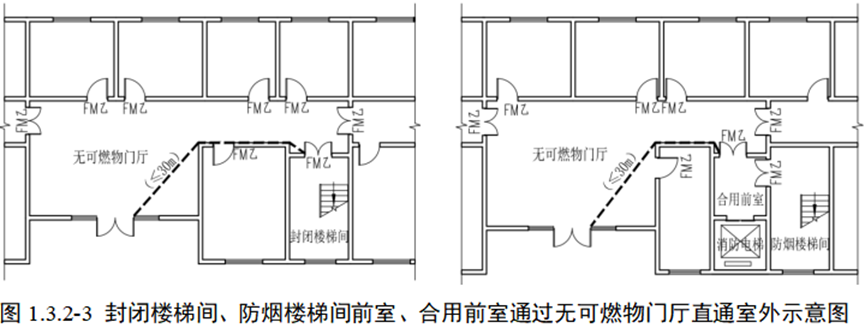 2.采用扩大的封闭楼梯间或扩大防烟楼梯间前室时,楼梯间到直通室外门的直线距离不应大于30m,详见图2.5.41.2图示二。