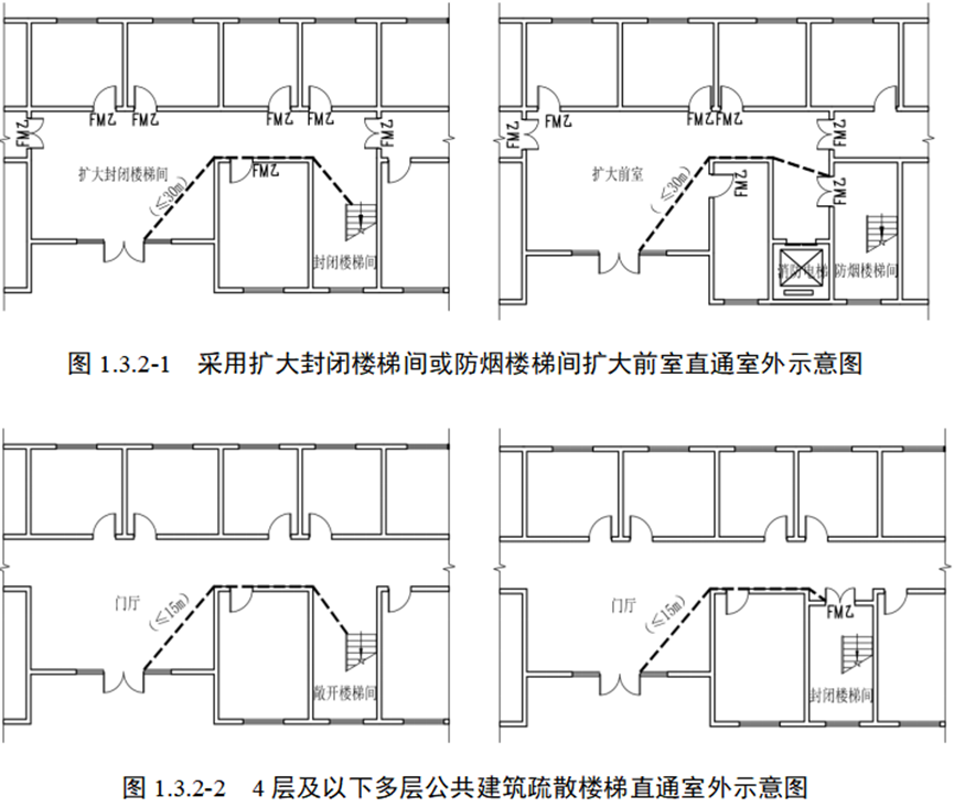 答:疏散楼梯应在首层直通室外,确有困难时,可在首层采用扩大封闭楼梯间或防烟楼梯间扩大前室直通室外,但楼梯间或前室的出口距离直通室外的门口不应大于30m(图1.3.2-1);对于4层及以下多层公共建筑,疏散楼梯间在首层可通过疏散走道、门厅直通室外,楼梯间的出口距离直通室外的门口不应大于15m(图1.3.2-2)。本条中的30m、15m,从楼梯间的疏散门(无门时从梯段踏步前缘)起算至室外安全区域,当建筑内设置自动灭火系统时也不应增加。封闭楼梯间、防烟楼梯间前室、合用前室可通过无可燃物的门厅直通室外,但应采用耐火极限不低于2.00h的防火隔墙与其他走道和房间分隔(图1.3.2-3);