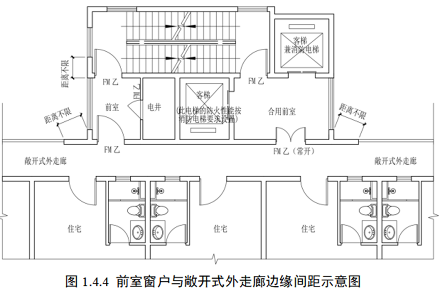 楼梯间、楼梯间前室、消防电梯前室及合用前室的窗户与敞开式外走廊边缘的间距是否不应小于1.0m?