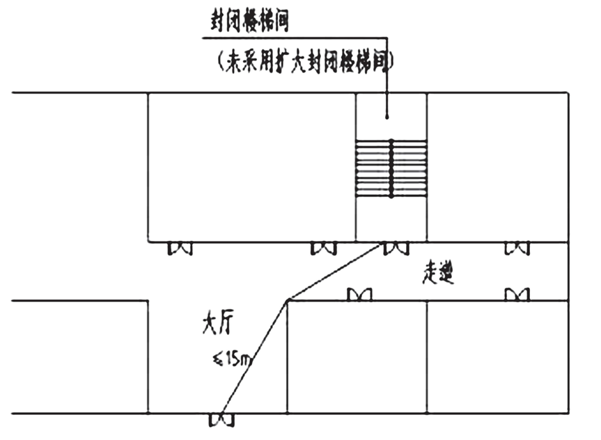 当层数不超过4层且未采用扩大的封闭楼梯间或防烟楼梯间前室时,可将直通室外的门设置在离楼梯间不大于15m处。此条在图示上仅表达了敞开楼梯间的情况,对于封闭楼梯间和防烟楼梯间,是否也可执行15m?