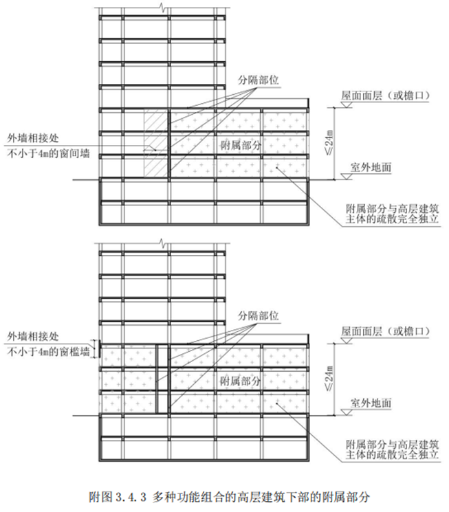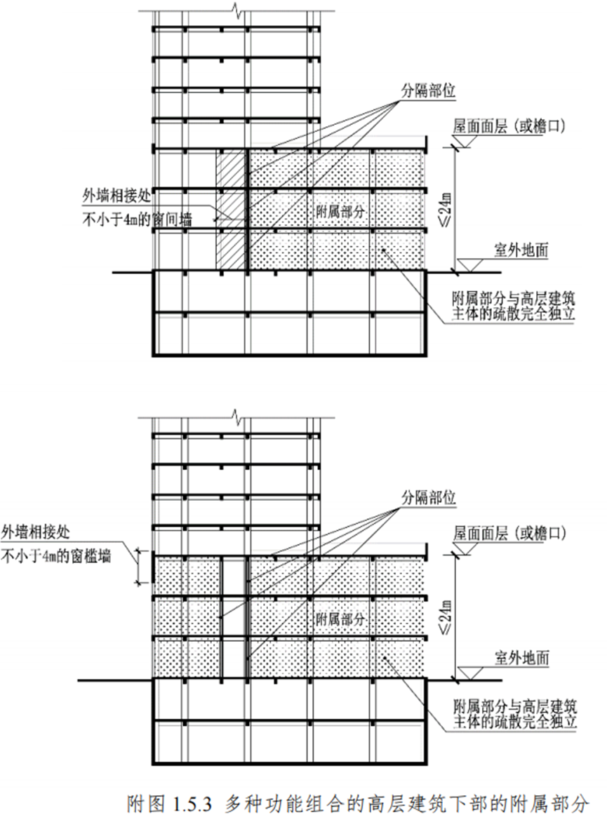 除住宅与其他使用功能建筑合建以外的多种功能组合的高层公共建筑下部的附属部分,当同时符合下列1~3款规定时,主体建筑与附属部分的安全疏散和消防电梯设置可根据各自的高度分别按规范执行;当附属部分同时符合下列1~4款规定时,主体建筑与附属部分的安全疏散、消防电梯和防火分区的设置可根据各自的高度分别按规范执行:(附图1.5.3)1与主体建筑相连且建筑高度不大于24m;2与主体建筑的疏散完全独立;3与主体建筑之间采用不开设门窗洞口(通风井道井壁不得开口,强、弱电、给排水管井井壁检修门采用甲级防火门)及不穿越通风管道的防火墙和不开设洞口(消防电梯井、上下管道井除外)且耐火极限不低于2.50h的楼板分隔;4与主体建筑相接处外墙上、下层开口之间的实体墙高度和两侧的门、窗、洞口最近边缘之间的实体墙宽度均应不小于4m;