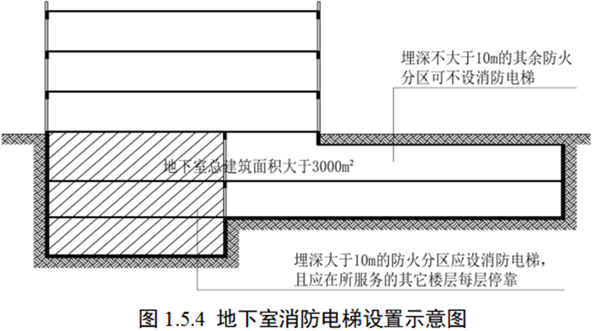 答:(1)当设置消防电梯的住宅建筑与公共建筑合建时,消防电梯可不在公共建筑部分(包括商业服务网点)的楼层停靠,公共建筑部分是否需要设置消防电梯应根据其所处部位的防火要求确定;(2)多种功能组合的建筑可以根据各功能部分所处部位的防火要求确定该功能部分是否应设置消防电梯,当某功能部分仅位于高度24m以下的楼层时,该部分可不设消防电梯(位于5层及以上且建筑面积大于3000㎡的老年人照料设施除外);(3)当地下、半地下室的上部建筑设置消防电梯时,上部主体的消防电梯应在地下、半地下室每层停靠(该消防电梯在本地下、半地下室的井道所处的防火分区已有可供使用的消防电梯时除外),若上部有两部以上消防电梯,可仅有一部消防电梯下至地下室;(4)总建筑面积大于3000㎡的地下或半地下室,其埋深大于10m的部分的每个防火分区可供使用的消防电梯不应少于1部,且该消防电梯也应在该地下、半地下室所服务的其它楼层每层停靠(图1.5.4);