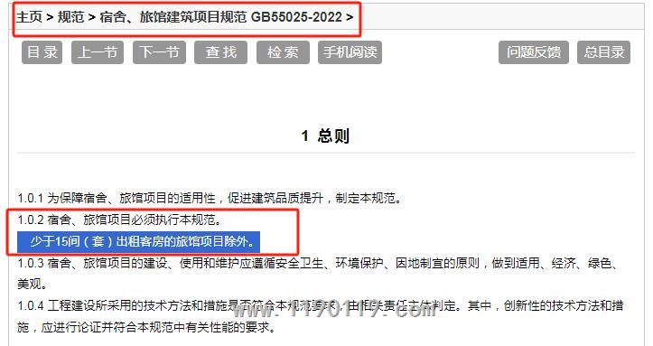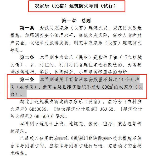 一般来说,数量不超过14间、最高4层、且建筑面积不超过800平方米的用于经营的客服属于农家乐(民宿),不强制参照宿舍、旅馆建筑项目规范 GB55025及旅馆建筑设计规范 JGJ62执行,可以参照农家乐(民宿)建筑防火导则(试行)执行