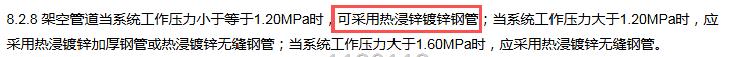 阀后系统工作压力不应超过1.2MPa,架空管道系统工作压力不超过1.2MPa可采用热浸锌镀锌钢管