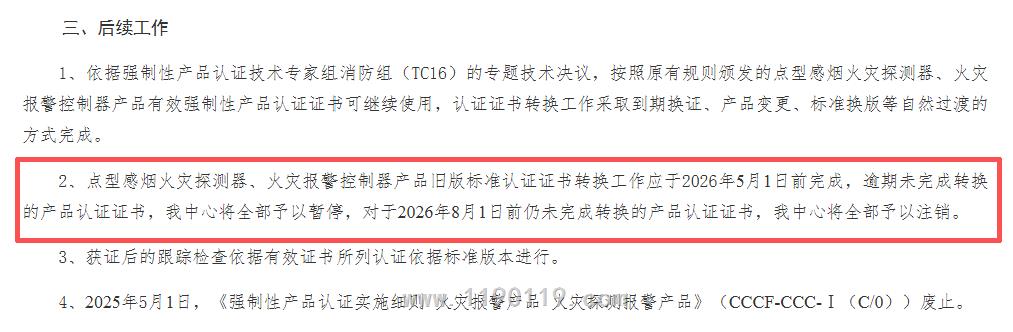 从通知可知,2026年5月1日前火灾报警控制器如果没有进行新产品强制性产品认证,旧证书将暂停使用。对于2026年8月1日前火灾报警控制器如果没有进行新产品强制性产品认证,则旧证书将注销