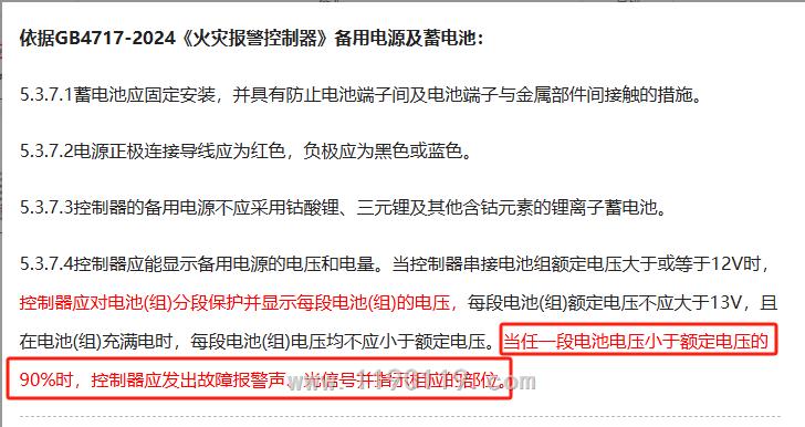 依据:GB4717-2024《火灾报警控制器》电池电压小于额定电压的90%时,主机就报故障。