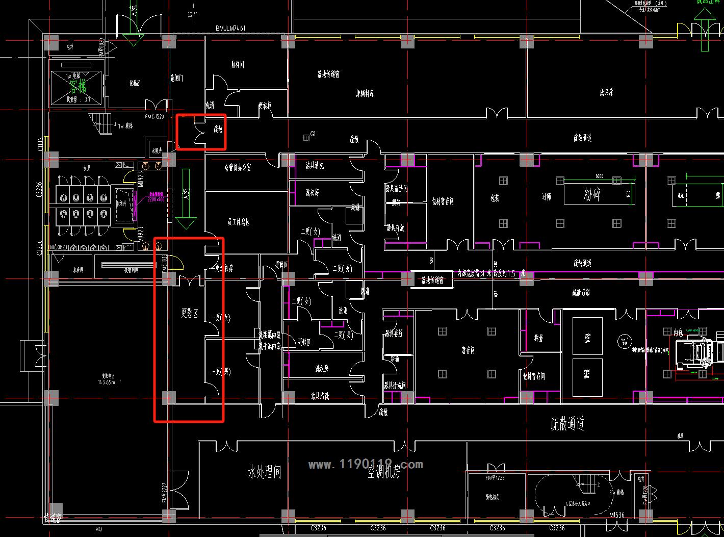 车间的疏散原则上是按大空间疏散,不像民用可以是房间加走廊的形式,像你这样布置各种小间也要找到最远点开始计算,通过实际路线疏散到最近的疏散的外门,距离不超规范上限。你图里有问题,走廊开门出来往上疏散至外门,要通过卷帘门,这是肯定不行的。