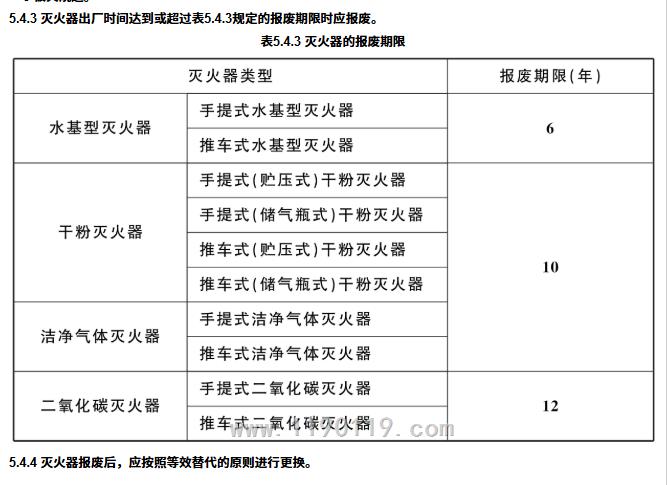 建筑灭火器配置验收及检查规范 GB50444-2008(干粉为例出厂日期五年后首次维修,往后每两年维修一次,干粉灭火器出厂10年时需要报废)