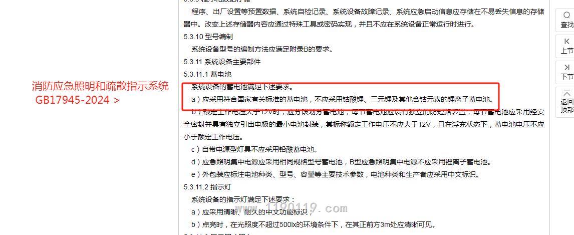 a)应采用符合国家有关标准的蓄电池,不应采用钴酸锂、三元锂及其他含钴元素的锂离子蓄电池。 b)额定工作电压大于12V时,应分段划分蓄电池,每节蓄电池应设有独立的防短路装置;每节蓄电池应采用经安全密封并具有独立引出电极的最小电池封装,其标称额定工作电压不应大于12V,且在浮充状态下,蓄电池电压不应小于额定工作电压。