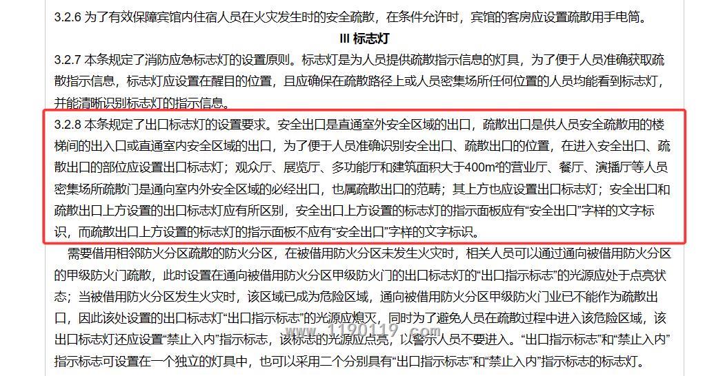 3.2.8 出口标志灯的设置应符合下列规定: 1 应设置在敞开楼梯间、封闭楼梯间、防烟楼梯间、防烟楼梯间前室入口的上方; 2 地下或半地下建筑(室)与地上建筑共用楼梯间时,应设置在地下或半地下楼梯通向地面层疏散门的上方; 3 应设置在室外疏散楼梯出口的上方; 4 应设置在直通室外疏散门的上方; 5 在首层采用扩大的封闭楼梯间或防烟楼梯间时,应设置在通向楼梯间疏散门的上方; 6 应设置在直通上人屋面、平台、天桥、连廊出口的上方; 7 地下或半地下建筑(室)采用直通室外的竖向梯疏散时,应设置在竖向梯开口的上方; 8 需要借用相邻防火分区疏散的防火分区中,应设置在通向被借用防火分区甲级防火门的上方; 9 应设置在步行街两侧商铺通向步行街疏散门的上方; 10 应设置在避难层、避难间、避难走道防烟前室、避难走道入口的上方; 11 应设置在观众厅、展览厅、多功能厅和建筑面积大于400m²的营业厅、餐厅、演播厅等人员密集场所疏散门的上方。