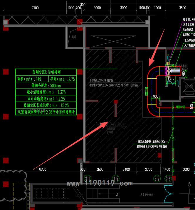 审图单位提出一个防烟分区内的不同高度区域最小清晰高度和设计清晰高度应按最小净高来计算,请教各位老师们,这个是有条文规定吗?如下图所示,此区域是地下一层非机动车库,阴影部分的净高2.3米(由于负二层做了抬高),其余部分2.7米,该防烟分区的最小清晰高度是按2.75米来计算的,挡烟垂壁也是设置在高度位置处,这样设计是否违反规范要求?